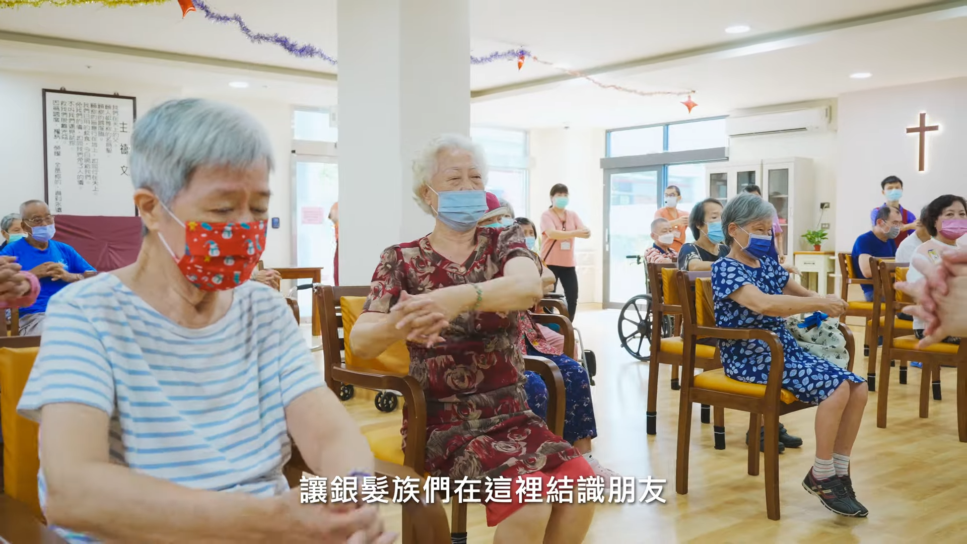 畫面穿插機構內部的醫療設施與照護空間,同時也捕捉職員們與長者互動的表情,